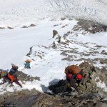 A Fekete-piramis. Ahogy a szakirodalom írja, 400 méter függőleges mászás sziklán és jégen. A kettes tábor fölött kezdődő falszakasz valóban komoly próbatétel, de azért korántsem olyan, mint ahogy azt vártam. A függőleges és meredek szakaszok, szikla és hó folyamatosan váltakoznak. A legnagyobb nehézség, akárcsak az Abruzzi-gerincen mindenütt, az extrém magasság, a hatalmas pakk a hátadon, és a rendkívül erodálódott kőzet, hiszen az időjárás rendesen aprózza a sziklát: a legnagyobb veszélyt a lavinák és a lezuhanó kövek jelentik, utóbbi különösen aggasztó, ha már vannak fölötted, vagy persze, ha alattad mozognak mások. A ki-kimozduló fogásokat és lépéseket mindig gondosan vissza kellett pakolni mielőtt leesnének, és nem egyszer úgy kellett félreugrani egy-egy robbanásszerű csattogással felénk pattogó sziklatömb elől! Az ilyen pillanatok még egy löketet adnak az egyébként is egekben járó pulzusszámnak.